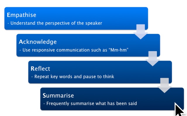 So when we talk about active listening we mean that we are consciously listening for cues and clues as to what the actual message is and not making assumptions or trying to shortcut to an answer because of our own experiences or beliefs about what may be going on.